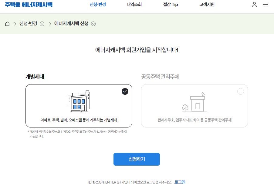 - 개별세대 대상의 경우, 신청 주소지에 거주하는 분으로서 주민등록표상 주소지구성원 1명이 온라인으로 신청하면 됩니다.