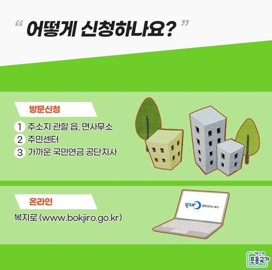 거주지 관할 읍면동 주민센터 또는 전국 국민연금공단 지사를 직접 방문하여 신청 가능합니다.